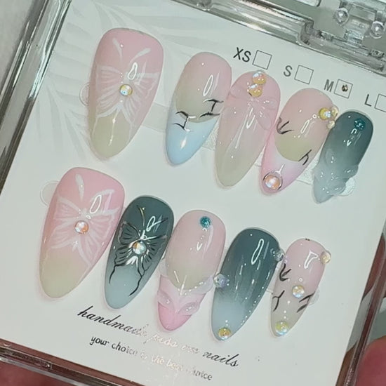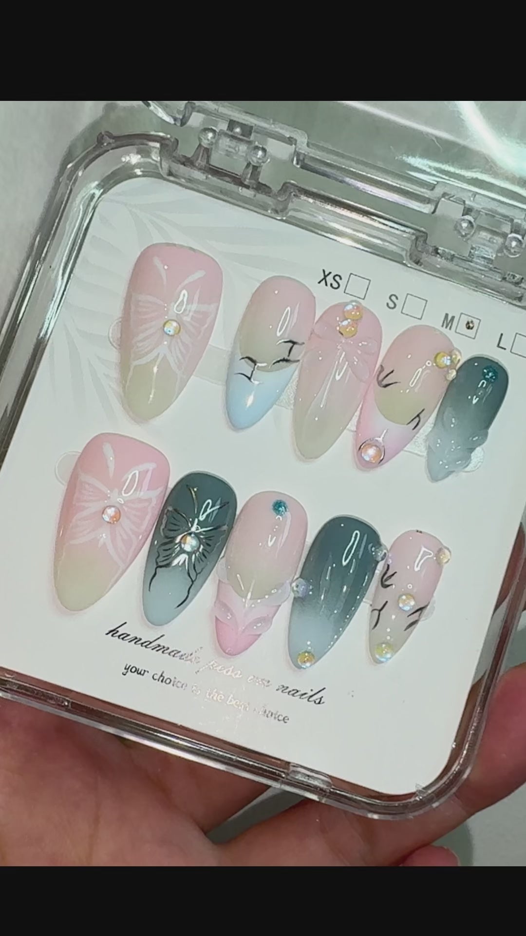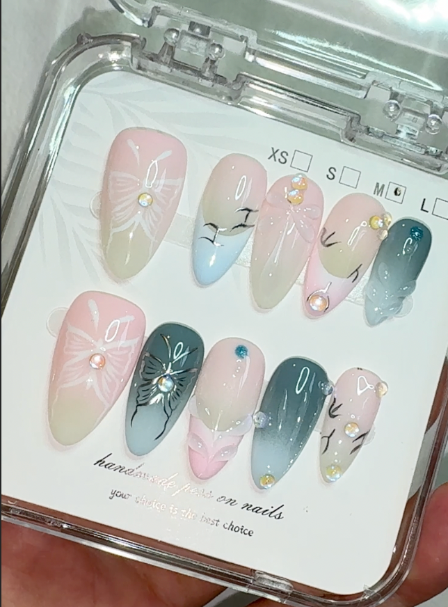 A soft blend of pastel pink and cool blue, Celestial Drift brings a calm, modern elegance to your everyday look. The subtle shimmer and gold accents add a touch of depth without feeling loud, making it an easy choice for workdays, weekends, or nights out. Designed for a comfortable fit and a natural finish, these press-on nails offer salon-level style with zero effort. Wear them when you want something refined, balanced and quietly eye-catching.