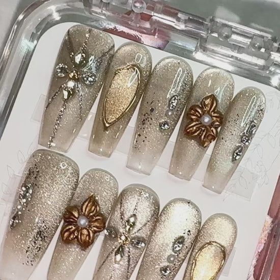 Champagne Petal features a soft champagne-gold shimmer paired with delicate floral and leaf accents, creating a warm, refined look with a touch of quiet luxury. The pearl-centred details and subtle metallic highlights add dimension without overwhelming the gentle neutral base, making this set perfect for special occasions, evening events or days when you want something polished and elegant. Comfortable to wear and easy to apply, it offers a balanced, luminous finish that feels sophisticated, feminine and effortlessly timeless.