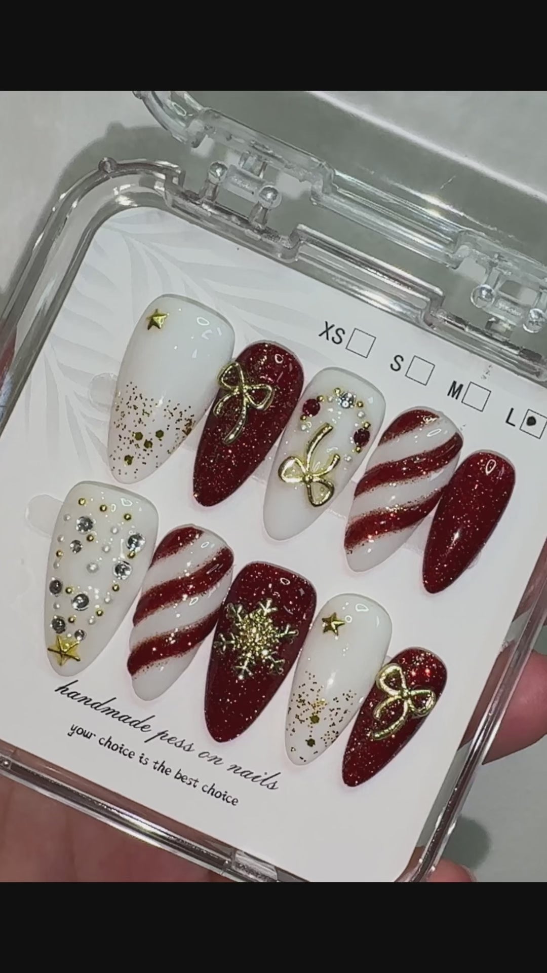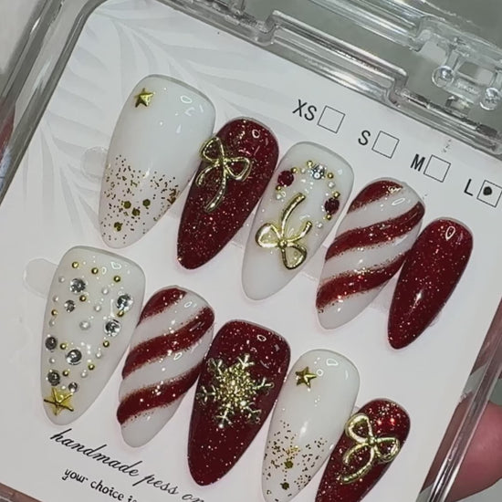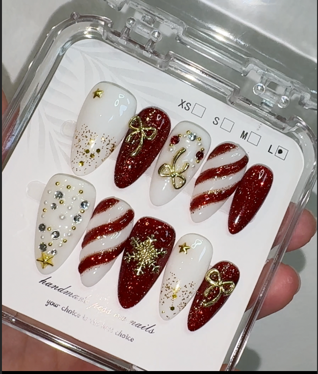 Crimson Noel blends deep burgundy tones with clean whites and gold accents, creating a festive look that feels elegant rather than playful. Candy-striped details sit alongside sculpted bows, tiny stars and snowflake motifs, giving the set a classic holiday feel with a refined twist. The rich colours and subtle shimmer make it perfect for end-of-year gatherings, dinners or any moment you want to add a touch of polished seasonal charm. Comfortable to wear and easy to apply, this set offers a balanced, grown-up take on holiday style — warm, striking and effortlessly festive.