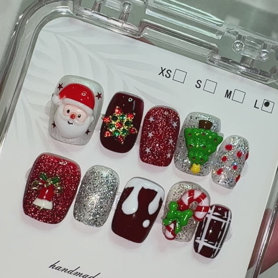 Holiday Icons gathers all the classic Christmas symbols — from Santa and tiny stockings to trees, wreaths and gingerbread motifs. Set against deep burgundy tones with touches of silver and festive greens, each nail feels like a small piece of the seasonal celebration. The illustrations are lively yet refined, offering a cheerful holiday mood without drifting into anything overly cute. Perfect for parties, family gatherings or simply embracing the year-end spirit, this set adds a warm, recognisable festive touch while remaining polished, modern and easy to wear.