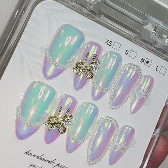 Prism Bloom pairs an iridescent, opal-like sheen with a soft lavender gradient, creating a cool-toned look that feels delicate yet unmistakably modern. Subtle sculpted metallic details add texture without overwhelming the clean, luminous finish. The shifting colours catch the light in a refined, jewellery-like way, making this set perfect for evenings out, events or days when you want something a little more expressive while still polished. Comfortable and easy to apply, these press-on nails bring a light-reflective glow that feels elegant, fresh and quietly eye-catching.