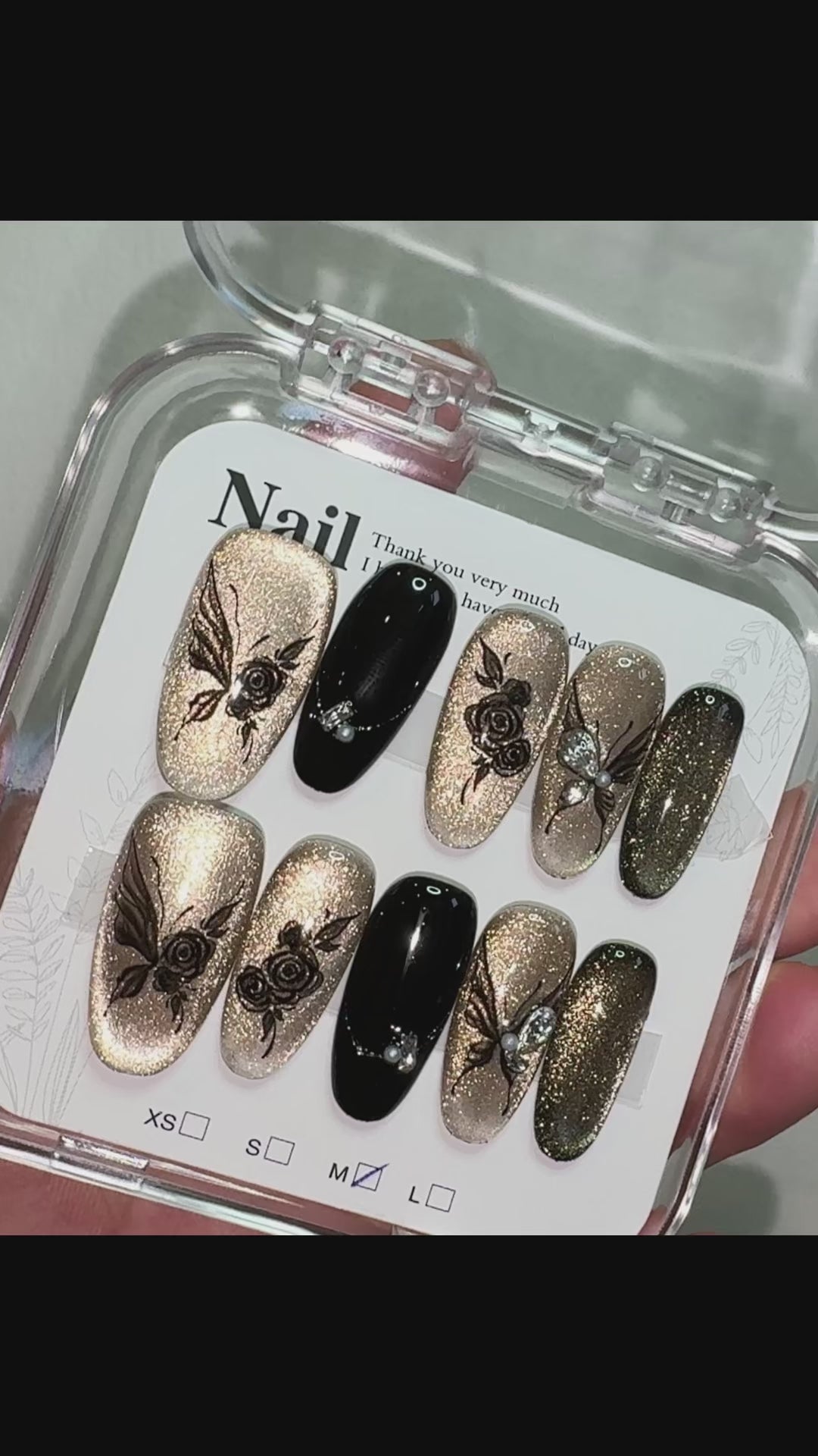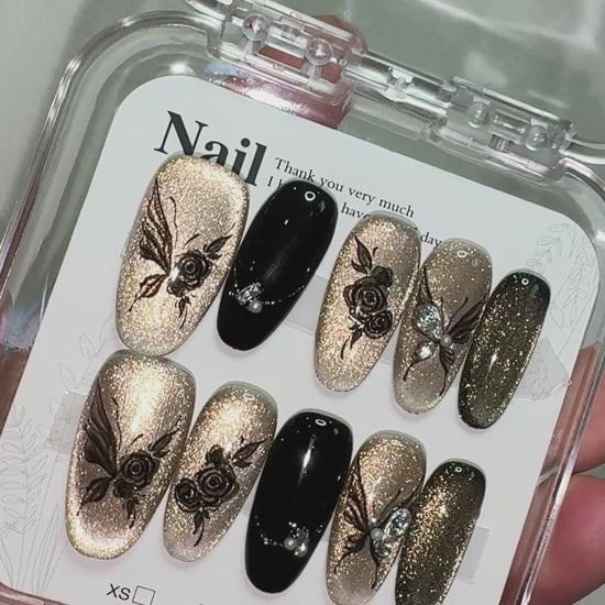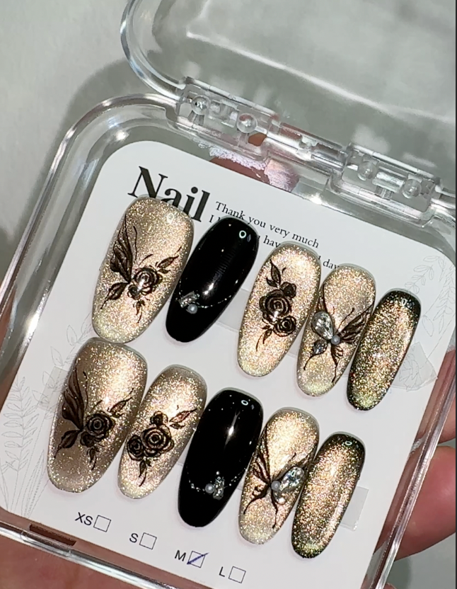 Shadow Bloom pairs champagne shimmer with deep black accents, brought together by fine floral silhouettes that add a subtle, modern edge. The contrast between soft gold tones and inky details creates a look that’s elegant yet quietly bold, offering a refined twist on classic floral designs. Light scattered shimmer gives each nail a polished, evening-ready finish without feeling heavy or dramatic. Comfortable to wear and easy to apply, this set is ideal for nights out, special occasions or moments when you want something sophisticated with a hint of mystery.