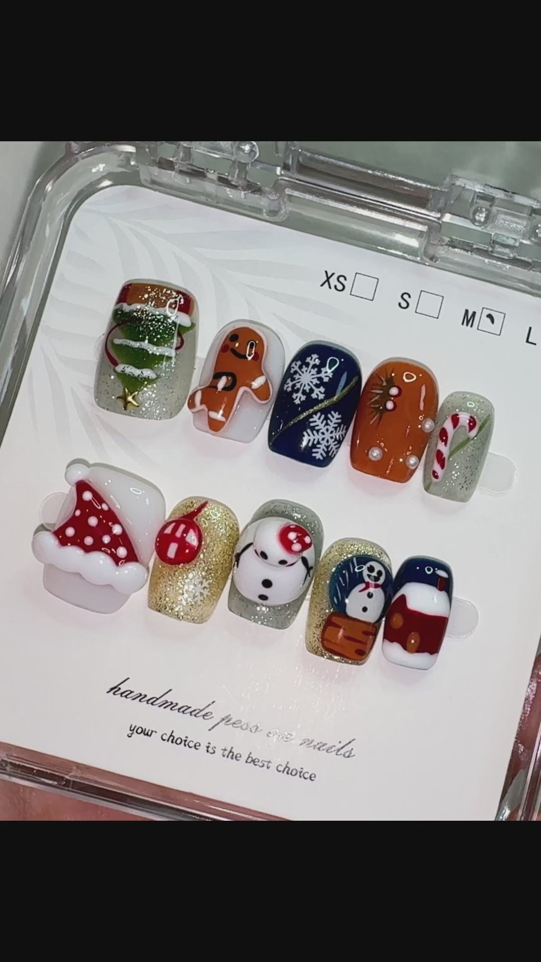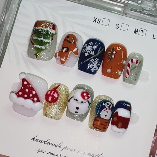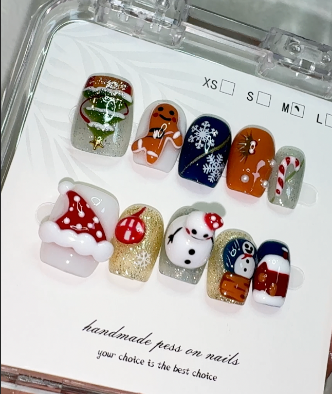 Winter Tales brings together hand-painted festive motifs — from snowflakes and tiny trees to warm gingerbread tones and classic holiday reds. Each nail carries its own small illustration, creating a cosy, seasonal feel that’s expressive without being childish. The colours are rich yet balanced, offering a cheerful look that remains modern and wearable for gatherings, end-of-year events or simply getting into the holiday spirit. Comfortable to wear and easy to apply, this set adds a warm, story-like touch to your seasonal style while staying polished and grown-up.